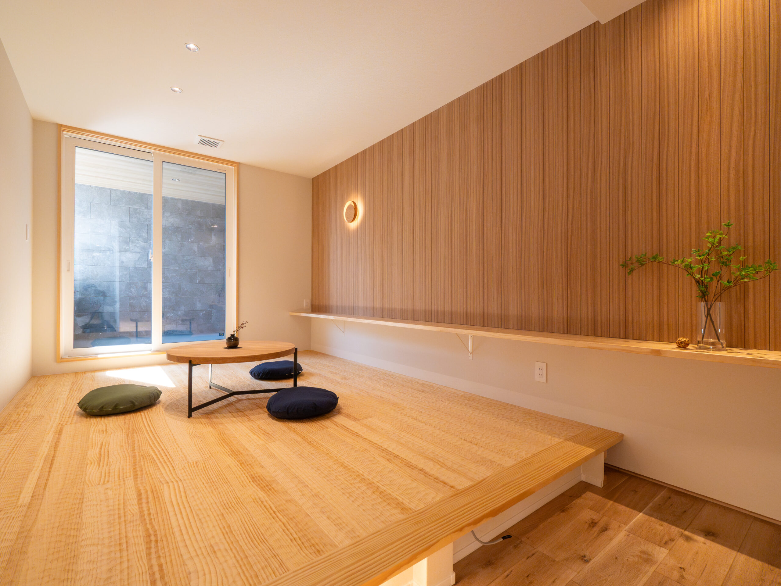 寝室は間接照明をとりいれ、和モダンなホテルをおもわせる雰囲気。